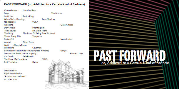 With the help of my Shazam app, the RCRD LBL daily download, and my retinue of music blogs, I put together a playlist of some 19 songs roughly fitting in this emerging genre, in a mix entitled, “Past Forward (or, Addicted to a Certain Kind of Sadness)” which you may download here.
